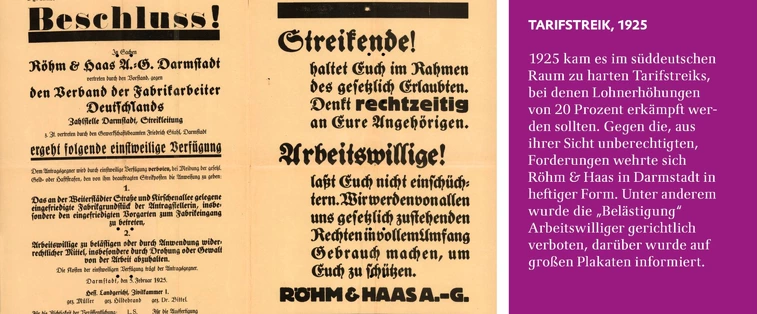 Im Wesentlichen spielte sich die Mitbestimmungsarbeit in der Praxis der 1920er Jahre auf zwei Ebenen ab. Auf der einen Seite galt es die Belegschaft in den immer wiederkehrenden Notjahren mit wesentlichen Materialien wie Brennstoffe, Lebensmitteln und Bekleidung zu versorgen. Und nicht selten ging es mit durchaus harten Bandagen um Tarifabschlüsse, für die auch in der Chemie nicht selten gestreikt wurde. Ein gutes Beispiel hierfür sind die Darmstädter Tarifstreiks des Jahres 1925, an denen auch die Arbeiter von Röhm & Haas beteiligt waren.