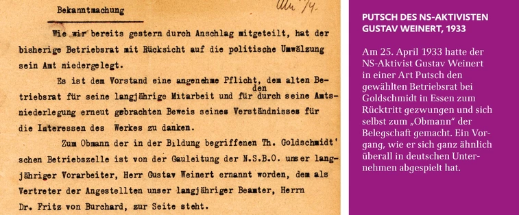 Das Frühjahr 1933 brachte in Deutschland dramatische politische Veränderungen – dutzende Länder verloren ihre gewählten Regierungen, tausende Städte ihre Bürgermeister. Ersetzt wurden sie durch NS-Funktionäre oder -Sympathisanten. Ähnliches spielte sich in der Wirtschaft ab, denn überall traten die zuletzt 1931 gewählten Betriebsräte zurück oder wurden dazu gezwungen. Als dann die freien Gewerkschaften am 2. Mai 1933 zerschlagen und anschließend verboten wurden, war die Weimarer Mitbestimmung am Ende.