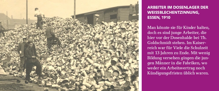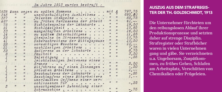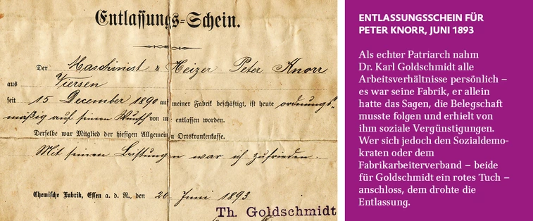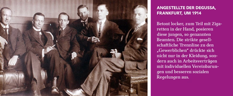 Anfang der 1880er Jahre schrieb die Fabrikordnung der Degussa eine gegenseitige 14tägige Kündigungsfrist fest. Ein ungewöhnlicher Schritt, da überall sonst von einem Tag auf den anderen entlassen bzw. gekündigt werden konnte. Besonders revolutionär war der Achtstundenarbeitstag (bei einer Sechstagewoche), den die Degussa 1884 – bereits 34 Jahre vor einem entsprechenden Gesetz - einführte. Die 1892 in Kraft tretende erste Arbeitsordnung von Th. Goldschmidt hinkte den Frankfurtern hinterher. Denn dort standen die Arbeiter weiterhin von Montag bis Samstag zehn Stunden täglich an den Maschinen. Da die Th. Goldschmidt jedoch mit großen Unternehmen wie Krupp um verlässliche Arbeitskräfte konkurrieren musste, gab es auch in Essen Ende des 19. Jahrhunderts mehr und mehr soziale Zugeständnisse für die Belegschaft. Einen Höhepunkt bildete 1909 die Eröffnung eines eigenen Ferienheimes im Grünen. Auch bei der Firma Röhm & Haas sah die Geschäftsführung schnell die Notwendigkeit, die Mitarbeiter durch soziale Zugeständnisse wie Bäder, Aufenthaltsräume oder verbilligtes Mittagessen an sich zu binden.
