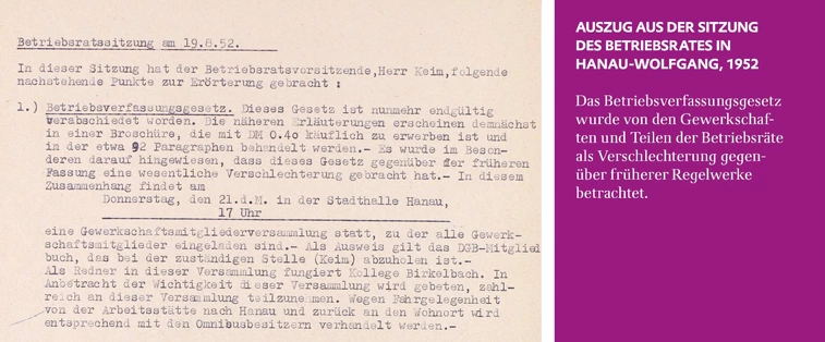 Mit dem am 11. Oktober 1952 verabschiedeten Betriebsverfassungsgesetz (BVG) wurde im Westteil Deutschlands die Mitbestimmung, die bis dahin auf Länderebene unterschiedlich geregelt war, bundesweit vereinheitlicht. Zu den Neuerungen dieses Gesetzes zählte vor allem die Möglichkeit, Gesamtbetriebsräte und Jugendvertretungen einzurichten. Auch die Festschreibung von Wirtschaftsausschüssen, in denen die Unternehmensleitung die Arbeitnehmervertreter über wirtschaftliche Belange informieren muss, war Teil des neuen Gesetzes. Gegenüber dem Gesetz der Weimarer Republik wurde das neue BVG von Teilen der Betriebsräte allerdings auch als Verschlechterung betrachtet. In der Summe reichte das Betriebsverfassungsgesetz dennoch deutlich über das 1920 erlassene Betriebsrätegesetz hinaus.