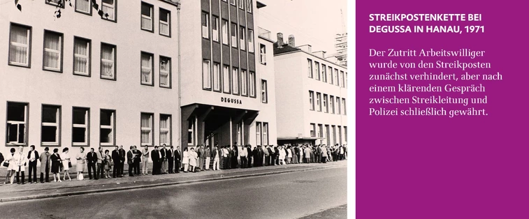 Anfang der 1950er Jahre trat der Manteltarifvertrag in Kraft, der die Aufgabenteilung in Lohn- und Gehaltsfragen regelte: Die zuständige Gewerkschaft vereinbarte Urlaub oder Zulagen, die Tarifbezirke handelten einen Tariflohn aus, während Betriebsrat und Geschäftsleitung vor Ort die individuellen Löhne verhandelten. So entstanden allmählich Differenzen zwischen tarifvertraglichen und tatsächlich gezahlten Löhnen, die teilweise bis zu 40 Prozent betrugen. Ein Fakt mit Konfliktpotential. Ein Arbeitskampf schien unausweichlich, unter anderem auch durch die sich allmählich verstärkende Konjunktureintrübung. Mit ersten Warnstreiks und Demonstrationen startete am 15. Juni 1971 ein Streik, der alle Vorgängergesellschaften von Evonik erfasste, wenn auch unterschiedlich intensiv. Er endete auf Vermittlung des Kanzleramtes nach rund vier Wochen mit einem Abschluss in Höhe von acht Prozent Lohnerhöhung – der bisher letzte große Streik in der chemischen Industrie.